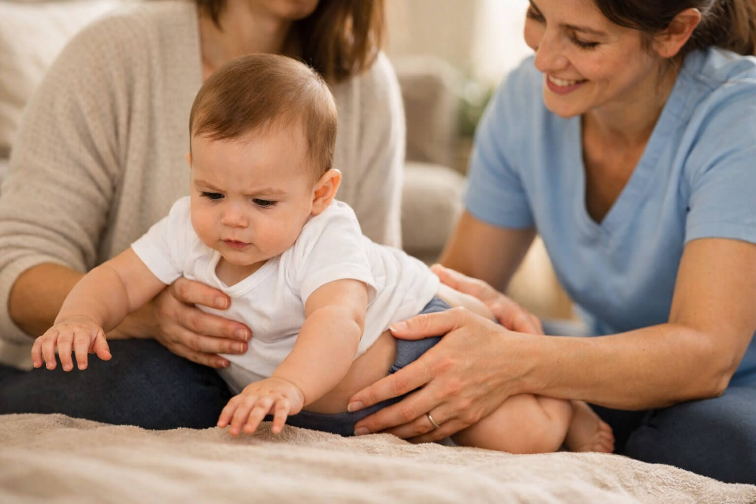 În loc să îl așezi mereu în scoică, foarte drept și rigid, uneori e mai util să îl ții în brațe astfel încât pelvisul să fie sprijinit și genunchii ușor flexați. În loc să îl schimbi pe o suprafață alunecoasă, unde simte instabilitate și se încordează, uneori o saltea fermă, un prosop rulat, o mână așezată calm pe trunchi fac diferența.