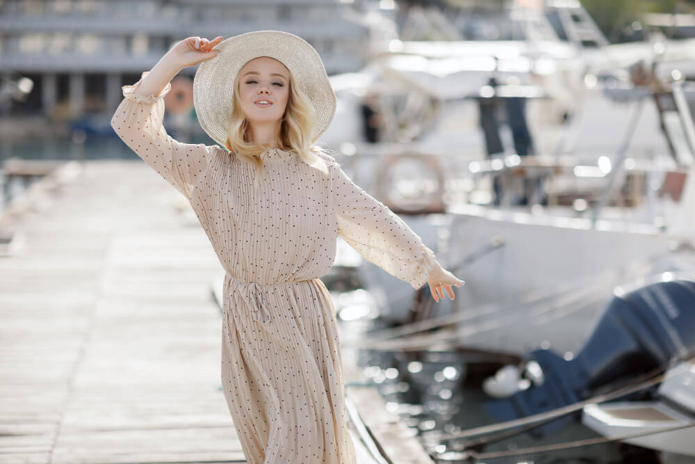 Cea mai elegantă femeie de pe yacht nu e neapărat cea cu rochia cea mai scumpă. E cea care zâmbește relaxat, care își poartă rochia cu naturalețe, care nu se foiește constant să-și aranjeze decolteul sau să-și tragă rochia în jos.